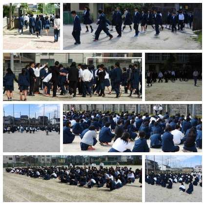 火災を想定した訓練を行い、教室からグラウンドへ全校生徒が避難しました。