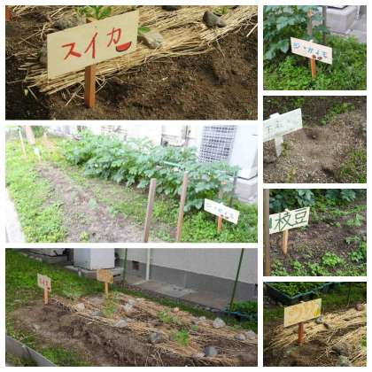 校内、中庭の菜園では5組の人たちがいろんな苗を植え、育てています。