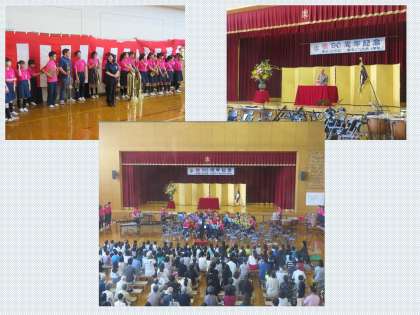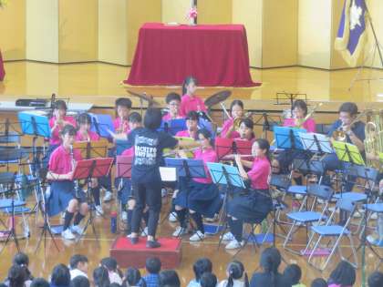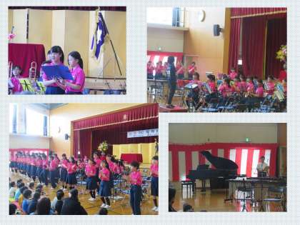 6月3日(日)午前中、南大内小学校で90周年記念式典が行われました。式典では本校吹奏楽部が出演依頼を受け、体育館で演奏させていただきました。小学校の在校生、教職員、地域や来賓の方が大勢、参加されました。迫力ある演奏を披露し、皆さんの大きな拍手をいただき式典を大いに盛り上げました。最後は南大内小学校の校歌を演奏し、全員で合唱しました。