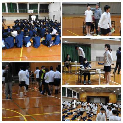 体育館で身長、体重を測定しました。