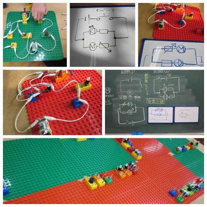 さて、授業ではここで、例え話を披露。実際に起こっていることを自分の考えに置き換えて、電源をスタート地点に10人で列をつくって歩くと分岐点にさしかかった時、広い道と狭い道があったらどっち行く?とか、ここで同じ条件になったら5人と5人で行くやろとか選択の自由や状況判断を加えました。最後に、ふと気が付いたら9人・・・次に気が付いたら7人になってるねん・・・なんでやろ?にちょっと考えたのち、”あっ、電気がなくなったんや”と気づいてくれました。やっぱり日常にある例えは効果覿面でした。電気回路図を描いて理論の話し合いをして、それぞれのワークシートに記入して提出です。これで、抵抗の違いによって電気の流れ方が変わるを理解できたと思います。ワークシートにはそれぞれ理由も記入してもらいました。これを個人の評価につなげます。