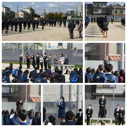 コロナウィルスの関係で、通常は体育館で行っていた着任式・始業式をグラウンドにて行いました。