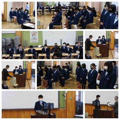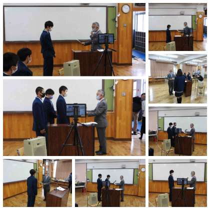 本日、7時間目にリモートによる伝達表彰と生徒会役員の認証式が行われました。