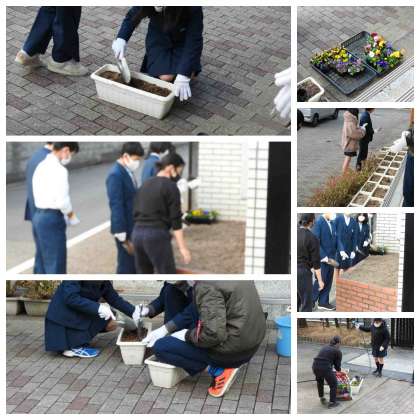 環境美化委員会によるプランターの花の植え替え作業が行われました。