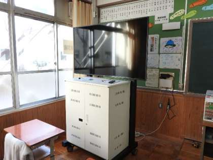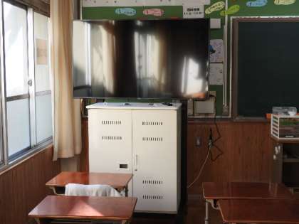 今日、1日かけて残りのタブレットPCの搬入。大型テレビ(モニター)、保管庫の設置が完了しました。