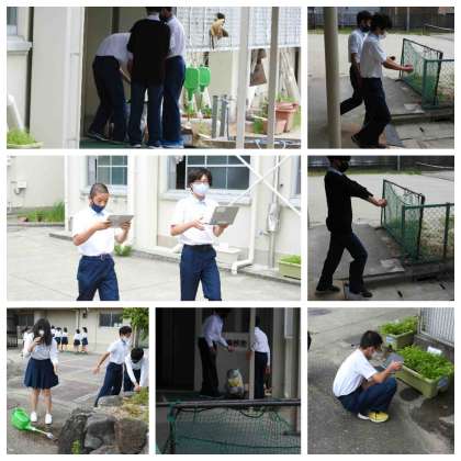 技術の授業では栽培している水菜の手入れと記録を撮っていました。