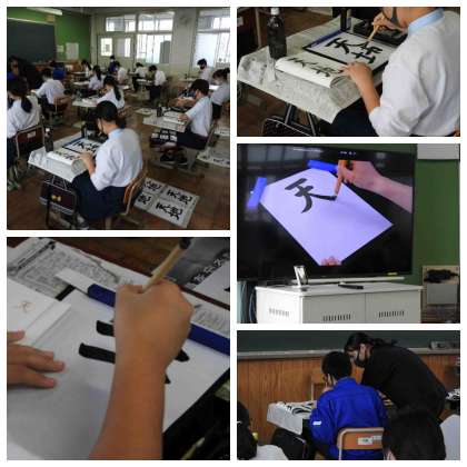 1年生では国語の授業で書道を行っています。教室のモニターには書き方の映像が流れていました。