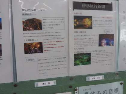 また、事前学習では個人でタブレットを使い修学旅行新聞を作成し、教室に掲示してあります。