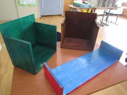 以前から技術の授業で製作していた棚が完成しました。木を切ったり,自分の好みの色を作って染色することにやりがいを持って取り組んでくれていました。それぞれ形や色に個性があり,素敵な作品です。