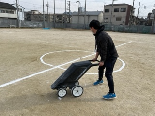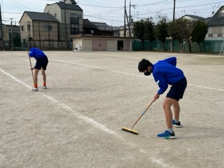 2限目からの球技大会に向けて、先生たち一緒にグラウンド整備を行なっています。