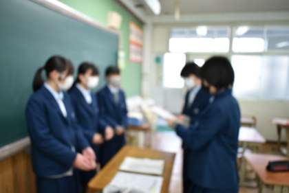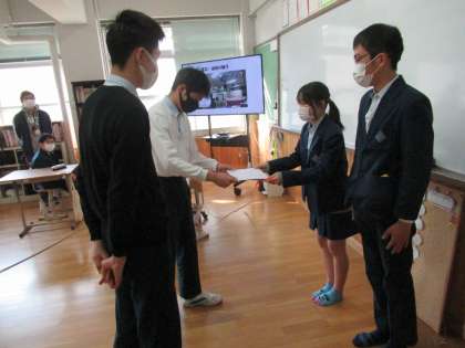 本日の4時間目に3年生を送る会が行われます。その招待状を朝学活の時間に1・2年生の文化委員から3年生の文化委員へ送られました。