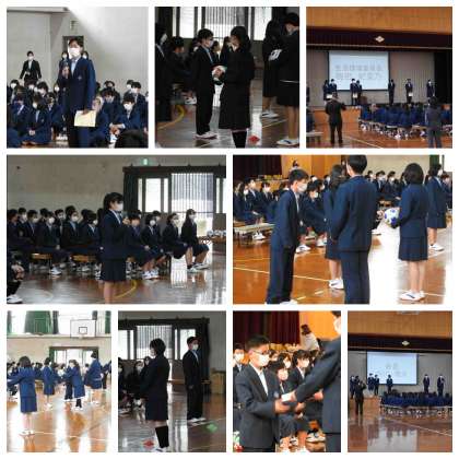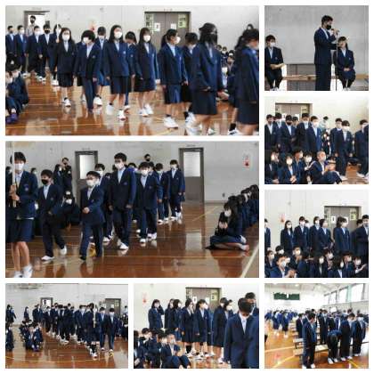 生徒会代表による歓迎のあいさつ。新入生に記念品を贈呈しました。