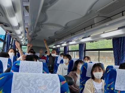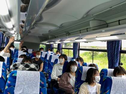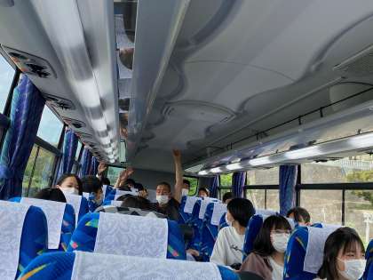 ラフティング会場到着までの間、バスレクを楽しんでいます。