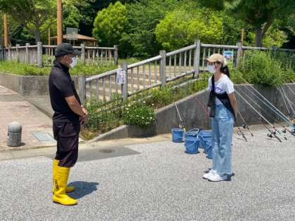 堤防釣りグループ、お世話になったインストラクターさんにあいさつをして、終了しました。中には、10匹以上釣れた人もいて、時間いっぱい楽しみました!