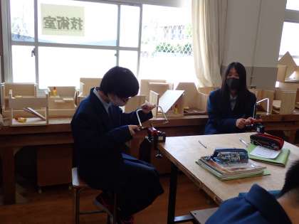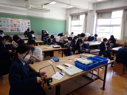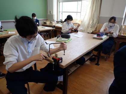 2年生の技術の授業の様子です。みんな一生懸命に道具を使い,金属板を切りぬいていました。完成が楽しみです。