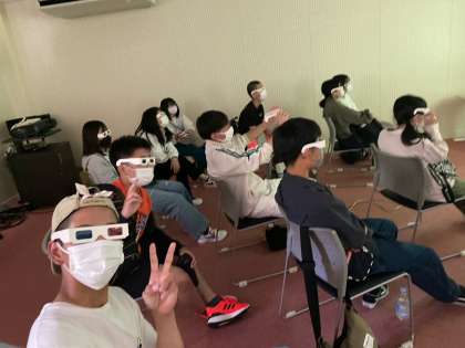 専用のメガネを付けて、3D映像を見ています。