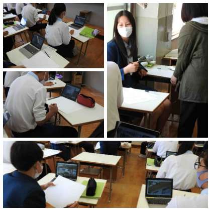 3年生の美術の授業では校内の風景がをタブレットで撮影し、その画像を見ながら絵を描いていました。
