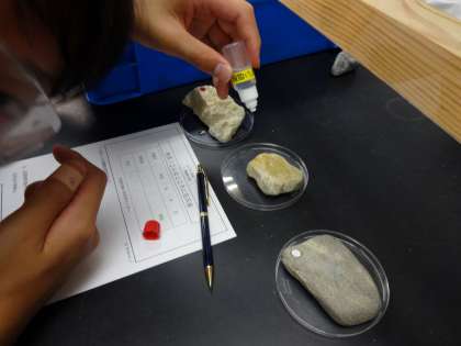様々な石を観察し、石灰岩を見つけたり、塩酸を使って、石灰岩になるものを調べたりしました。百何万年、何億年前の石の観察もできました。最後には、石灰岩と塩酸を反応させ、二酸化炭素を発生させる実験も行いました。
