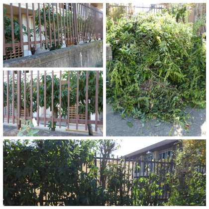 東門付近と体育館東側の樹木の剪定を管理用務員さん、事務員さん達たちで行っていただきました。ありがとうございました。