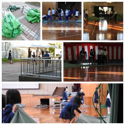 体育館準備や中庭のテント立てを部活動の生徒たちが手伝ってくれています。