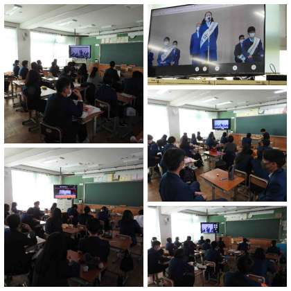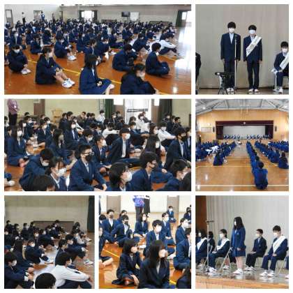 1、2年生は体育館で3年生は教室(リモート)で演説を聴きました。