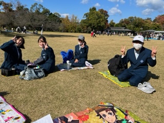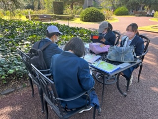 職員さんへのインタビューを終え、みんなで昼食!天候にも恵まれ、外で食べる昼食は格別です。昼食後はみんなでMAPを見て、自分たちで植物を観察するルートを話し合っています。
