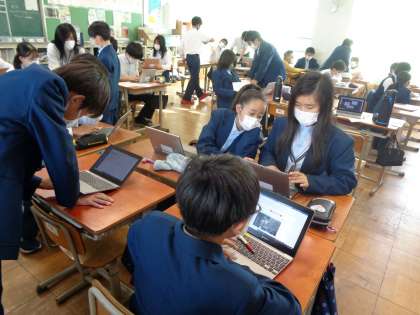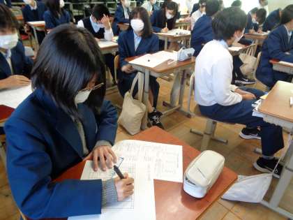 今日の学活は盛りだくさん。後期の学級委員の決定や1、2年生は昨日の校外学習のまとめの制作に皆さんがんばっています。また、第4回テストも迫ってきましたから、テスト週間の学習計画に取り組んでいる姿も見られました。