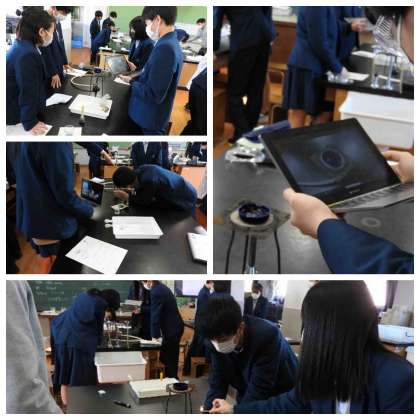 3年生理科の授業は実験を行い、動画をタブレットで撮影しています。