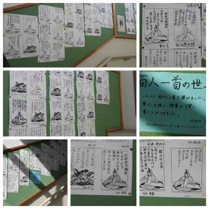 2階から3階にあがる階段掲示版には百人一首の歌が掲示されています。1枚1枚上手に仕上げていました。