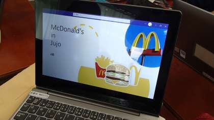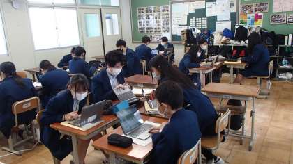 2年英語の授業の様子です。明日に行われるプレゼンテーション(発表)の作成に取り組んでいます。題は「My Favorite Place in Our Town」で、自分の町のおすすめ場所について発表し、その場所の特徴やよい点を伝えます。どのグループも興味深いおすすめスポットを考え、準備しています。