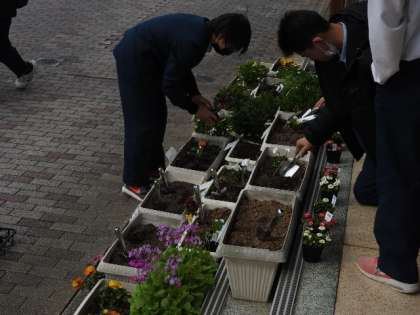 放課後に生活環境員さんたちが来週の卒業式に向けて西門付近のプランターの植え替え作業を行ってくれました。