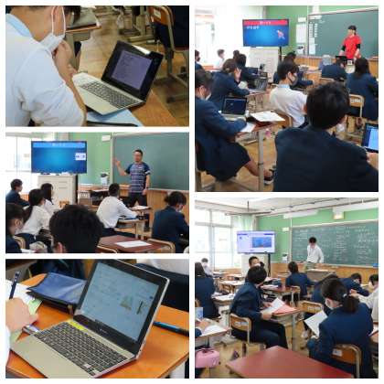 数学では、板書をTeamsに提示して、自分たちで確認しながら授業を進め、保健体育の授業では、パワーポイントで全体に提示しながら、生徒たちはロイロノートを使って自分の考えを入力していました。