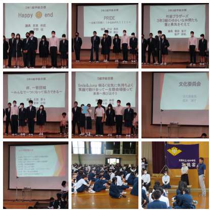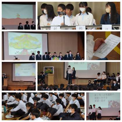 生徒会スローガン「ぐんぐん伸びるぜ! 八条の樹」のもと、生徒会や議会、専門委員会の今年度の活動方針が提案されました。また、各クラスの学級目標も紹介され、自分たちが目指すクラスの思いもしっかり伝えてくれました。