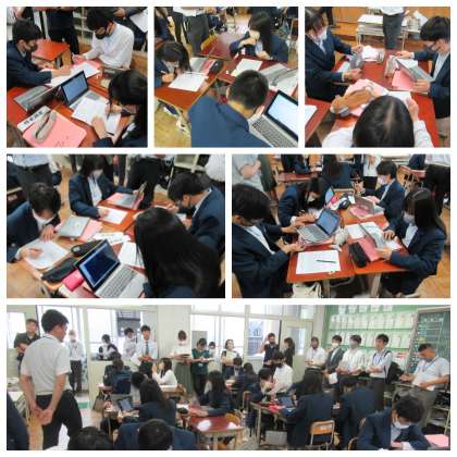 こちらも「リーディングDX」の一環として、3年生数学「標本調査とデータの活用」を教材にして、タブレットや資料を活用しながら、自分の考えを交流することができていました。