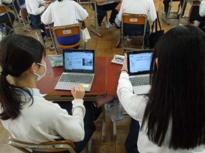 3年生では、先月行った修学旅行について、学んだことや今後活かしたいことを、後輩に伝えるために、パワーポイントを作成しています。