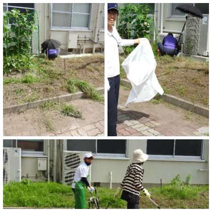 そこで、教頭先生、事務員さん、管理用務員さん、校務支援員さんたちが協力して一斉に草刈りを行ってくれています。