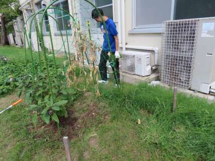 先週から来ているインターンシップの学生が、管理用務員さんと一緒に中庭の草を刈ってくれていました。