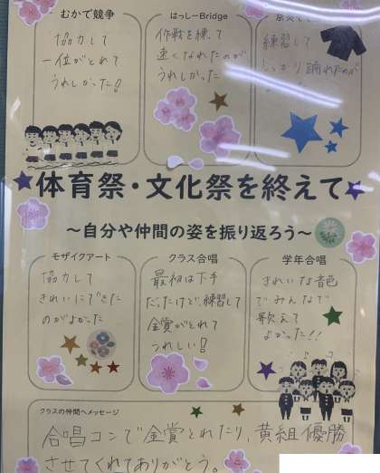 3年2組のNさん、体育祭・文化祭を終えての感想で感謝の気持ちが込められたメッセージが書かれていました。