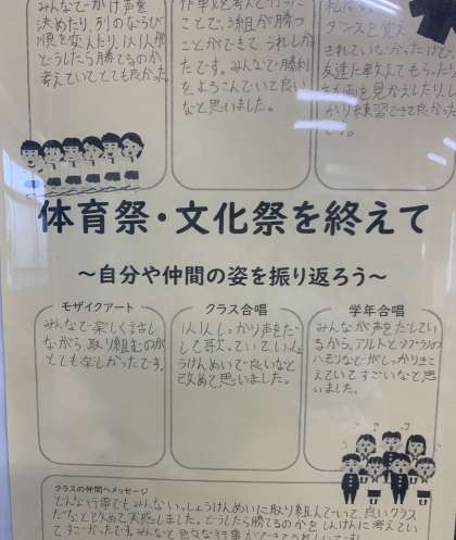 3年3組のHさん。体育祭・文化祭を終えての感想で3組がいいクラスだと実感していますね。みんなと共に行う行事が充実していたようですね。クラスの一員として取り組めたところに「きらり☆」ですね。