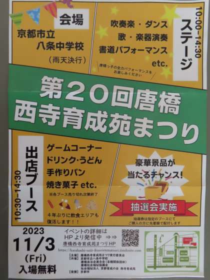 11月3日(金・祝)に、八条中学校にて「西寺育成苑まつり」が行われます。