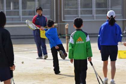 地震補強工事のため,テニス部は唐橋小学校のグラウンドをお借りして活動を続けて着ました.今日は小学校で「土曜学習」が開かれていて,その一環として希望者を募り「ソフトテニス教室」を開催いたしました.9人の希望者があり,約1時間ではありましたが,女子のテニス部員の手ほどきを受けて,白球を追いかけていました.