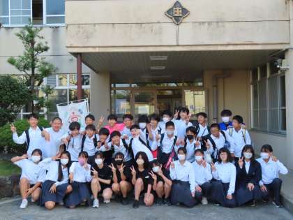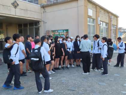 約30人の生徒が唐橋小学校を訪問し、代表生徒が教頭先生に案内文を渡してくれました。