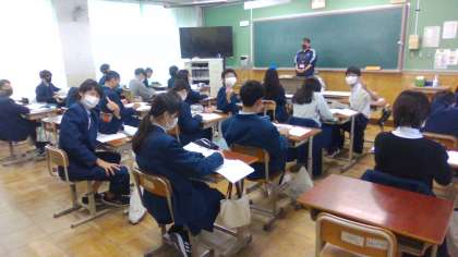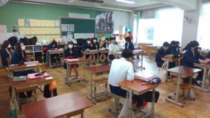 今日はノーベルデーで、1日チャイムは鳴らないので、時計を見ながら自分たちで声をかけながら席についています。特に3年生はチャイムが鳴る3分前にはベル着出来ています。来週からの定期テストに向けて、みなさん頑張りましょう。