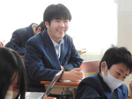 昨日、国語の研究授業が行われ班に分かれて話し合い活動がありました。2年2組のMさんは記録係を任され、出てきた意見を素早くタブレットで入力していました。素早いタイピングに「きらり☆」です。