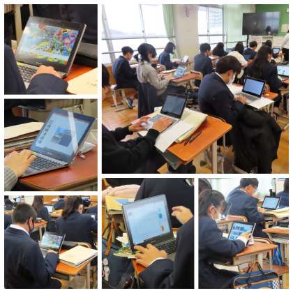 英語の授業では、「外国の人におすすめの場所を紹介する」パワーポイントを作成しています。たくさんの資料の中から、自分が伝えたいことに合う資料を一生懸命探していました。