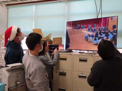 また、今回はYouTubeライブ配信もあり、職員室のモニターにもその映像を流しています。