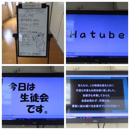 また、今日のHatube(はっちゅーぶ)では、生徒会から卒業生へのメッセージ動画が流れています。たくさんの失敗を重ねながら、さまざまなことにチャレンジして成功を収めています。