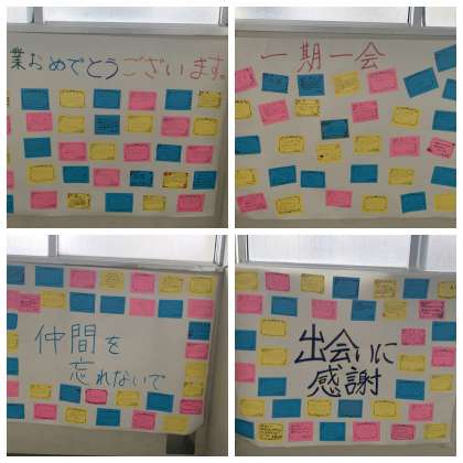 後輩たちからのお祝いのメッセージが掲示されています。