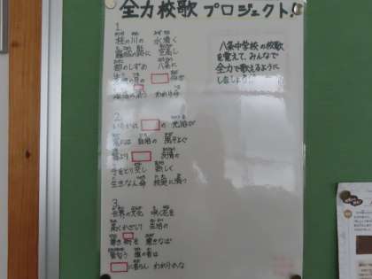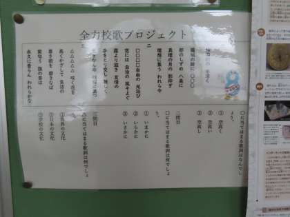 各フロアの掲示板等に、校歌の歌詞が掲示してあります。ぜひ、校歌を覚えて、集会等での校歌をしっかりと歌ってください。