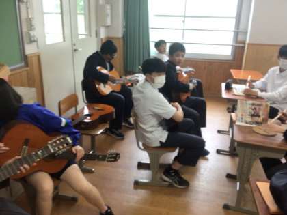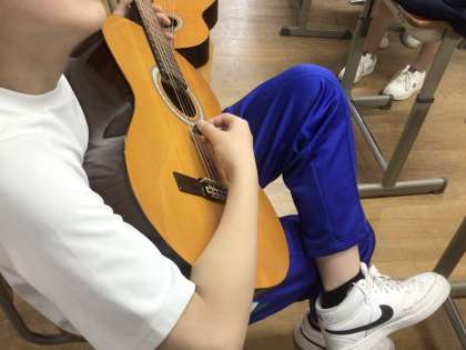 2年生の音楽の授業では、ギターの基本的な取り扱いを学び、ピックを使ってストロークする練習をしました。また、スティックとコルクボードを使ってリズムを刻んだり、同じリズムで息を合わせて合奏もしました。元気でエネルギーあふれる音が音楽室に響き渡っていました。